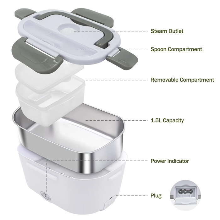 Ovaj spremnik za grijanje hrane sadrži dva uklonjiva spremnika kapaciteta 1,5 L i plastični spremnik od 0,45 L, koji se mogu koristiti naizmjenično.