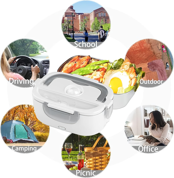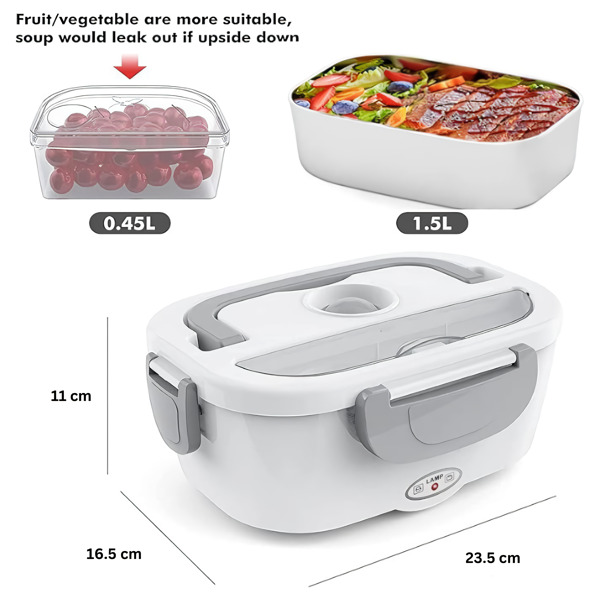 Dva uklonjiva PP pretinca drže vaše glavno jelo i prilog odvojenima – a oba idu ravno u perilicu posuđa nakon toga. Radi u uredu, u automobilu, na gradilištu ili u bilo kojoj prostoriji sa strujnom utičnicom.
