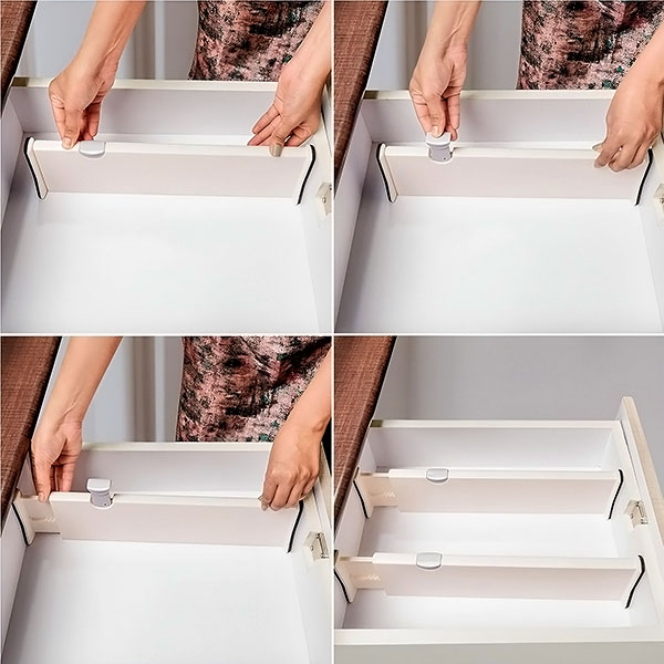 Preobrazit ćete svoje prepune ladice u sekundi. Jednostavnim instalacijama “Move and Click”. Organiziranje nikada nije bilo lakše. Samo stavite, prilagodite i zaključajte razdjelnik na svoje mjesto – nije potreban alat niti ljepilo.