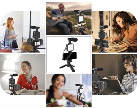Budite kreator sadržaja kakav ste oduvijek željeli biti. 🌟 Stolni stativ | LED rasvjetno tijelo i mikrofon (potrebne su AA baterije | Držač telefona | Bluetooth daljinski upravljač (potrebne su baterije CR 2032 3V) | Baterije nisu uključene