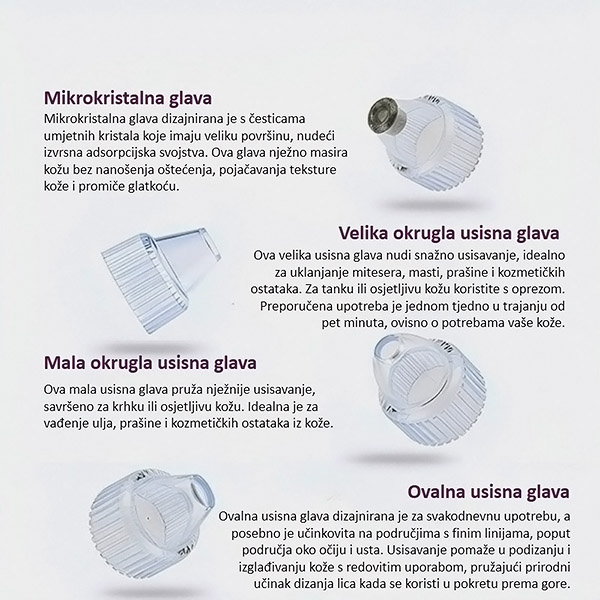 Uređaj dolazi s 4 izmjenjiva nastavka, od kojih je svaki dizajniran za specifične probleme s kožom. Pogledajte donju sliku za više detalja o tome kako svaki nastavak funkcionira!